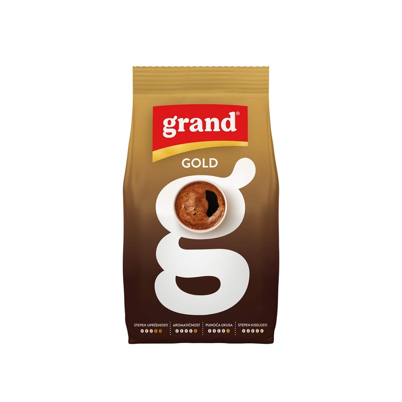 Prepusti se uživanju u omiljenom i mirisu i ukusu Grand Gold kafe, napravljene od pažljivo odabranih, srednje uprženih zrna kafe.